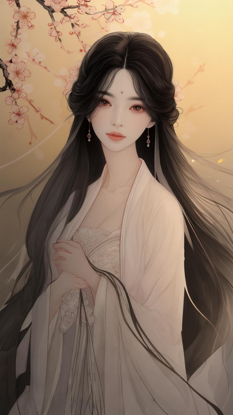 A stunning digital painting of an elegant East Asian woman dressed in traditional hanfu-style attire. She has long, flowing black hair and delicate facial features, with soft makeup and a serene expression. Her gaze is calm and gentle, and she wears ornate earrings and a subtle decorative mark on her forehead. The background is a warm, soft golden gradient with delicate cherry blossom branches gracefully arching in from the side, adding a dreamy and poetic atmosphere. The overall style is ethereal, graceful, and romantic, evoking a sense of ancient beauty and timeless elegance.